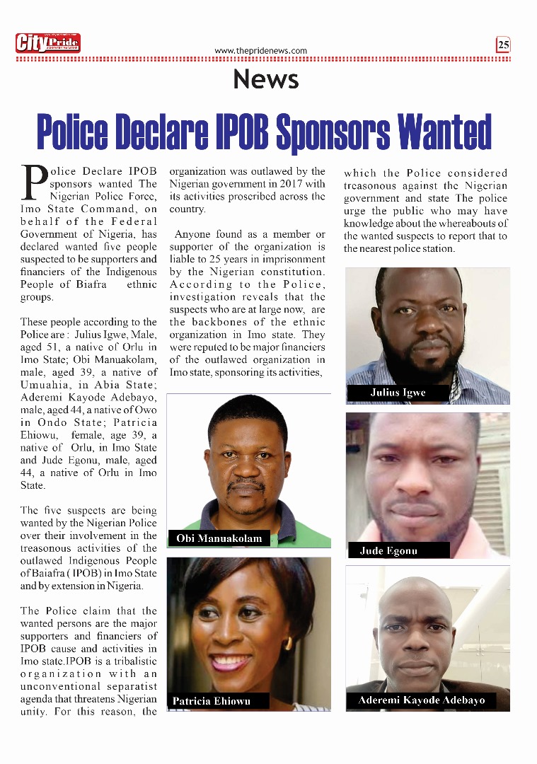 The Nigerian Police Force, Imo State Command, on behalf of the Federal Government of Nigeria, has declared wanted five people suspected to be supporters and financiers of the Indigenous People of Biafra ethnic groups.