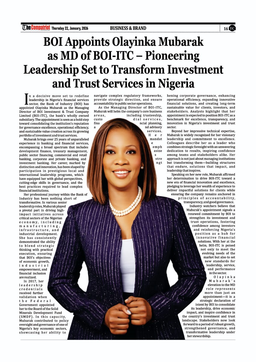 Olayinka Mubarak’s elevation to the MD role represents more than just an appointment—it is a strategic declaration of intent by BOI to consolidate its leadership, drive economic impact, and inspire confidence in the country’s investment and trust landscape. Stakeholders now look forward to a period of robust growth, strengthened governance, and transformative leadership under her stewardship.